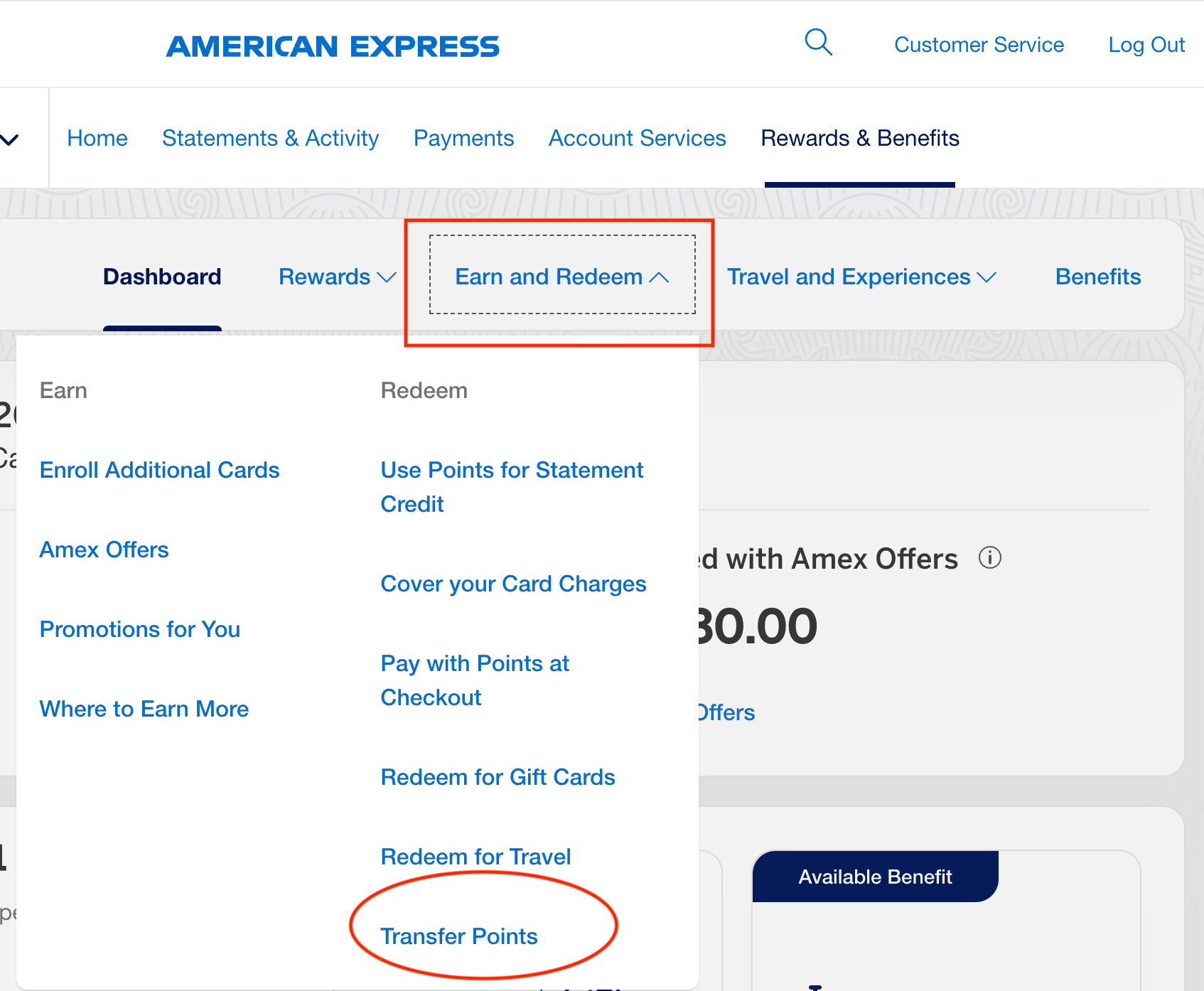 1. Start by logging into your AMEX account at americanexpress.com, then navigate to the Account Home page of one of your credit cards, and click on ‘Rewards & Benefits.’
