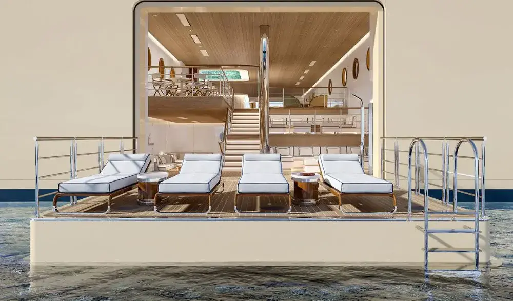 The yacht will feature 95 expansive suites and guest rooms. Every room has a private terrace and offers sweeping, panoramic views through unimpeded, floor-to-ceiling windows.