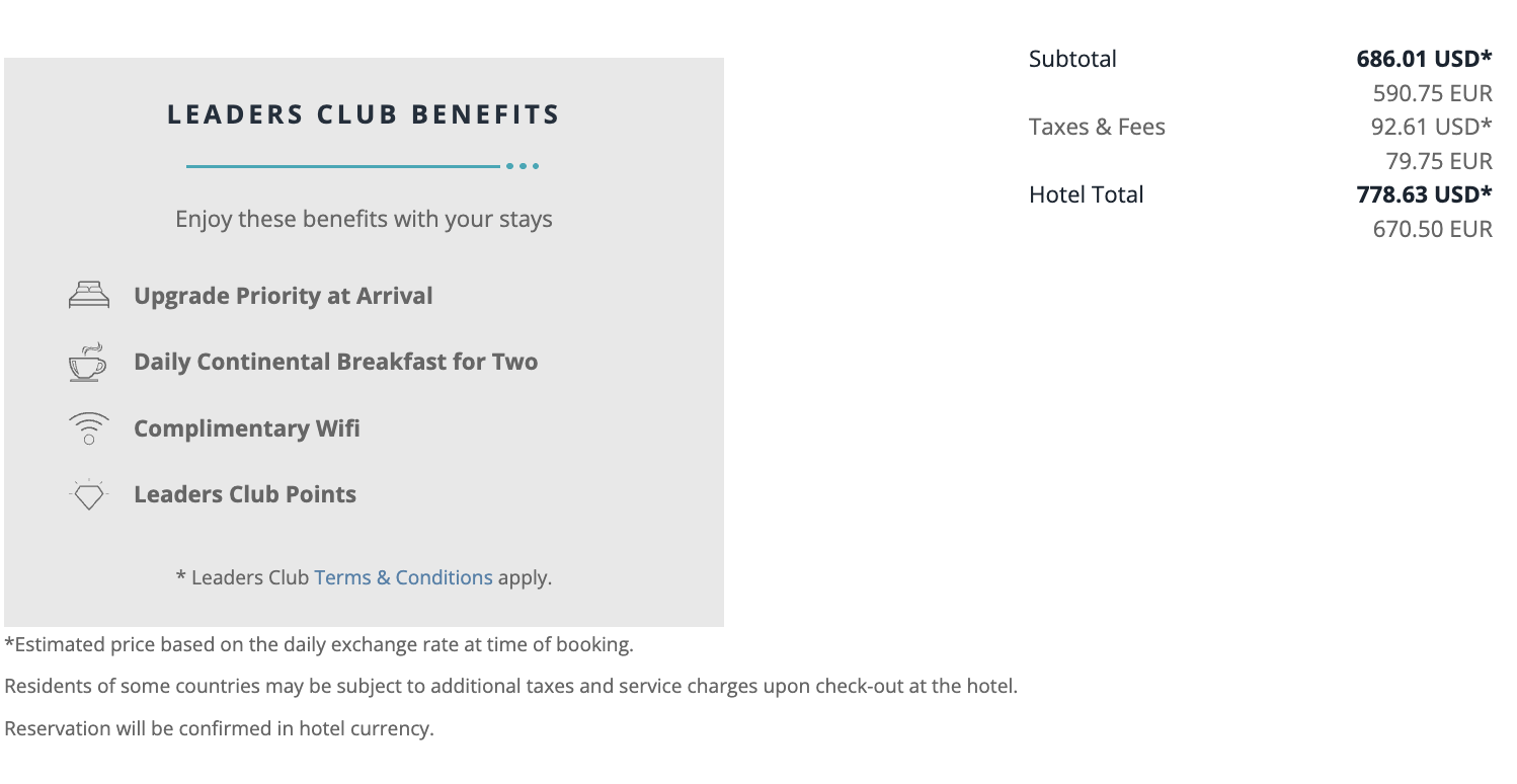 To make matters even better, I noticed a few other rates hidden in a drop-down on the site. One rate was actually for a cheaper deluxe king room, which would cost €675.50 all-in, and sure enough those Leader Club Benefits were noted.