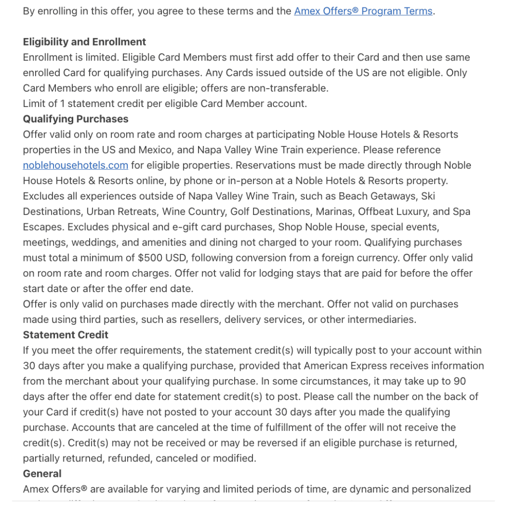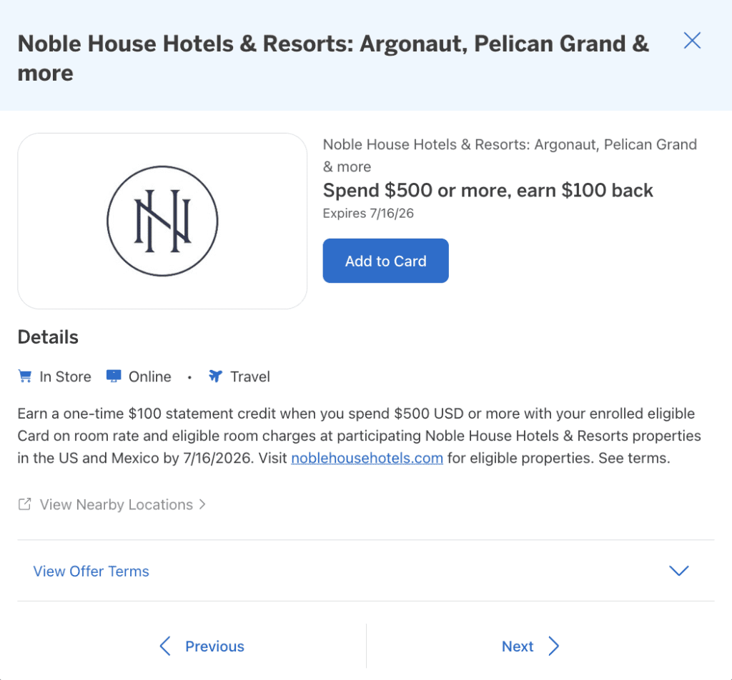 American Express recently refreshed its merchant offers, and there’s a new one with Noble House Hotels & Resorts. You’ll earn a $100 statement credit when you spend $500 or more at Noble House Hotels & Resorts.