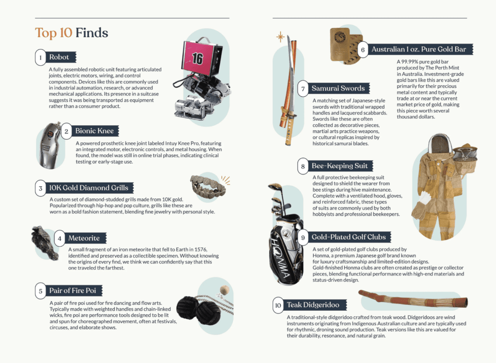 ​Unclaimed Baggage, the US’s “Only Lost Luggage Store,” recently dropped its Top 10 Finds of 2025 in the 2026 issue of The Found Report. If you’re unfamiliar with Unclaimed Baggage, the company’s name is the dead giveaway – it’s a retailer of lost luggage and is based in Scottsboro, Alabama. It sells abandoned airline baggage contents—including clothing, electronics, jewelry, and luxury goods—at steep discounts after airlines fail to find the original owners. While the company maintains an online store, allegedly the true experience is in visiting the store in person.