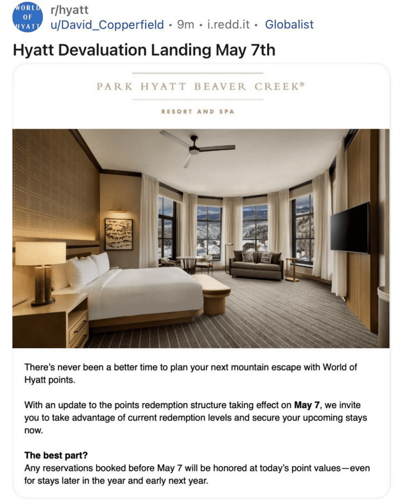 This is according to a message posted to the r/hyatt subreddit. Reddit user u/David_Copperfield posted a screenshot of a note from the Park Hyatt Beaver Creek, which reads as follows: